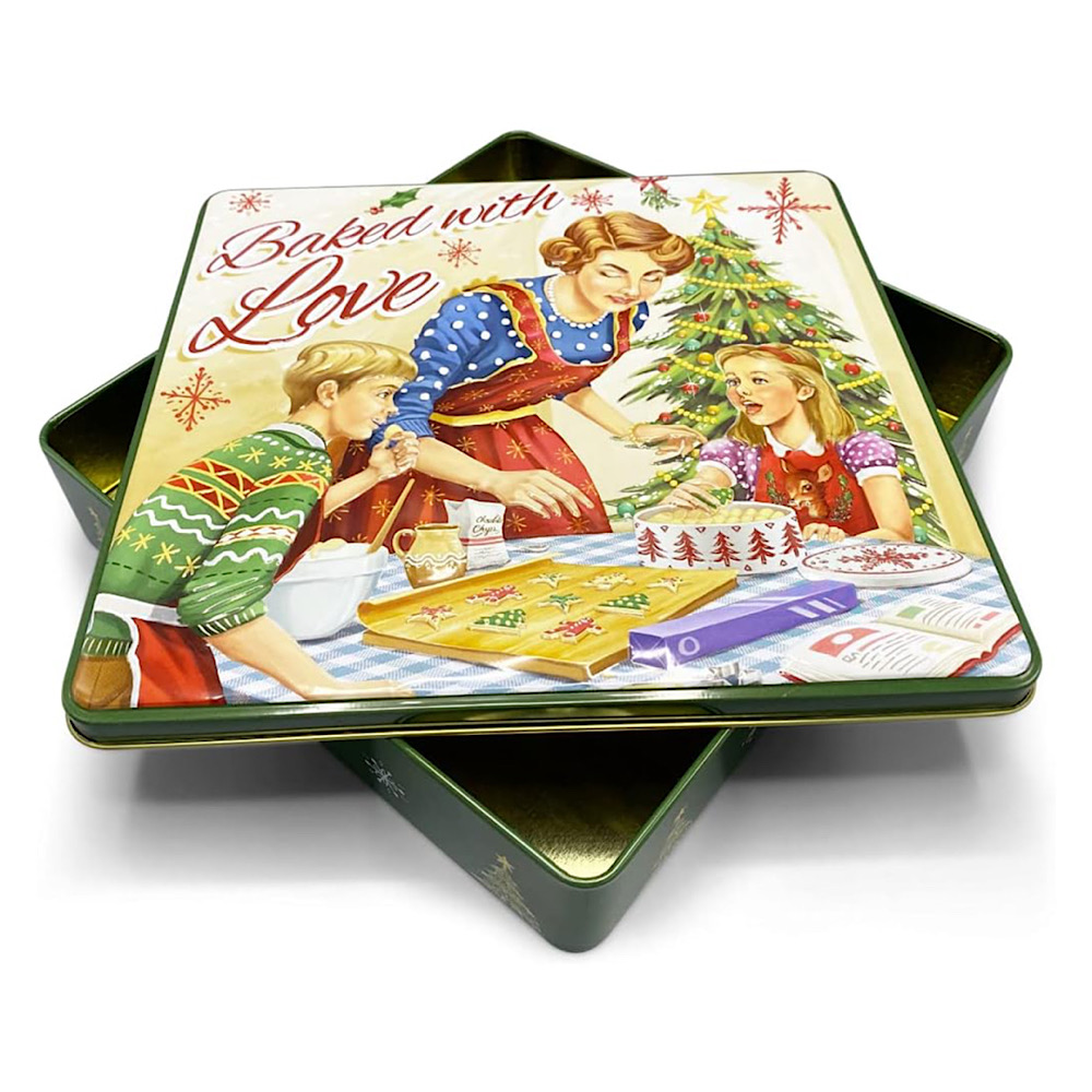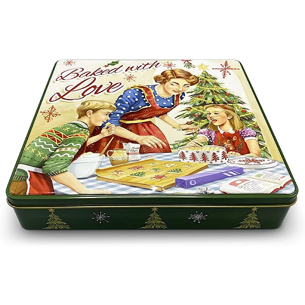 - MediMuc präsentiert eine rechteckige Dose mit Aufschrift “Baked with Love” im Retro-Look mit vielen Details.