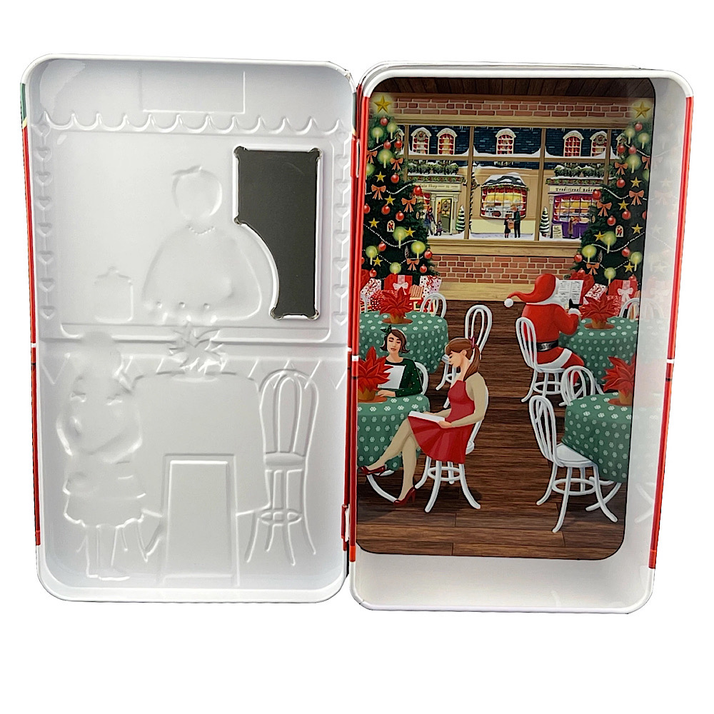 - der Deckel hat ein Scharnier zum Öffnen. Innen ist die Dose ebenfalls bedruckt.