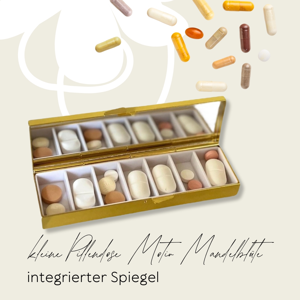 - In diese elegante Pillenbox mit Spiegel passen ca. 3 -4 normale Tabletten oder 1 – 2 größere Tabletten – die Fächer haben ein Maß von: Länge 26 mm, Tiefe 8 mm, Breite 14 mm