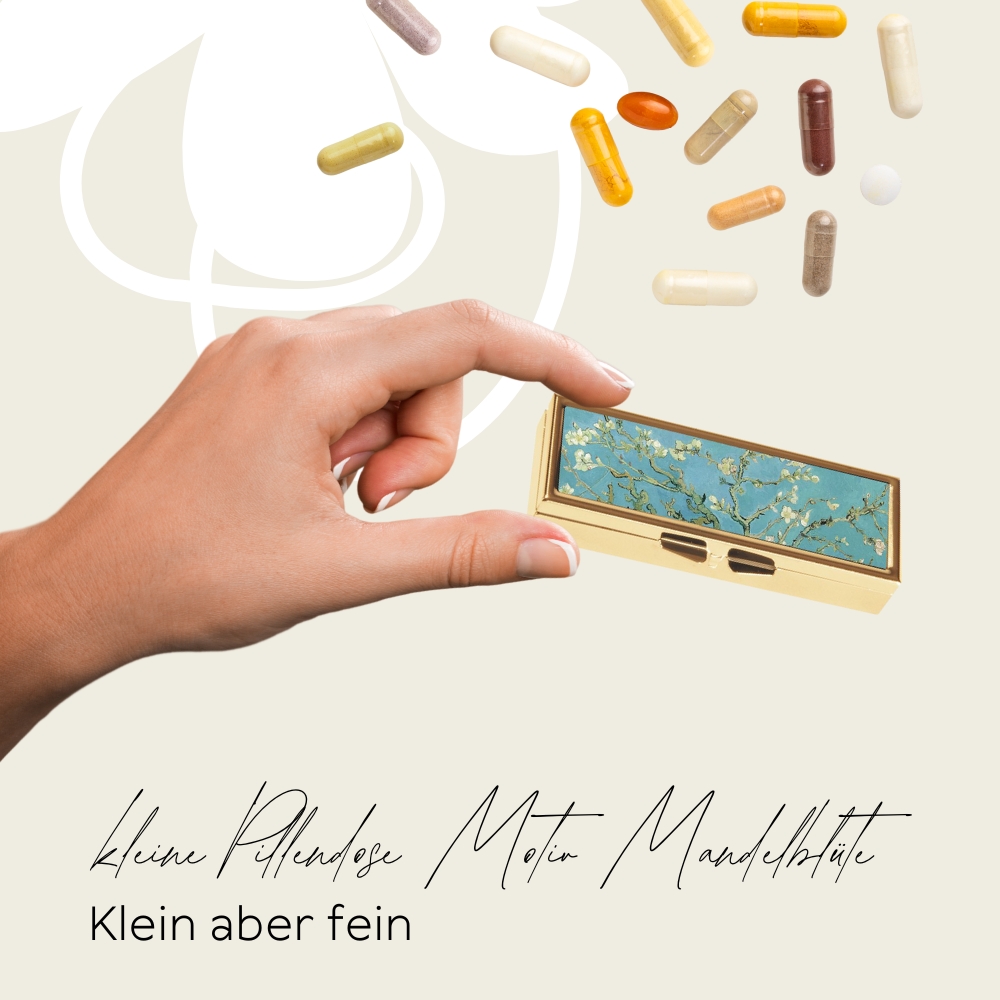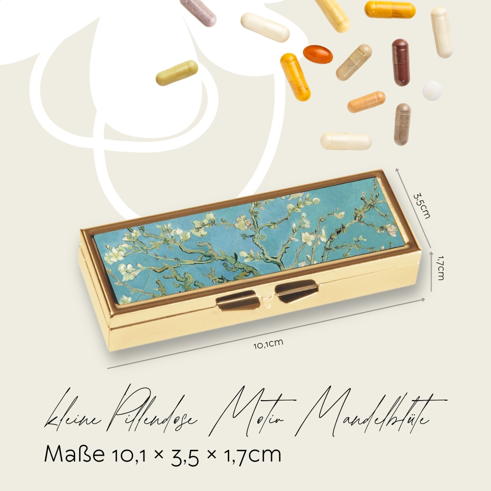 - Eine bezaubernde Pillendose aus der FridolinEdition mit individuellem Motiv von Van Gogh “Mandelblüte” auf dem Deckel ist ein praktischer Begleiter für den täglichen Medikamenteneinnahmeplan. Mit ihrer Funktion, die Einnahme von Tabletten und Pillen zu organisieren, bietet sie eine einfache Möglichkeit, den Überblick über die Medikation zu behalten