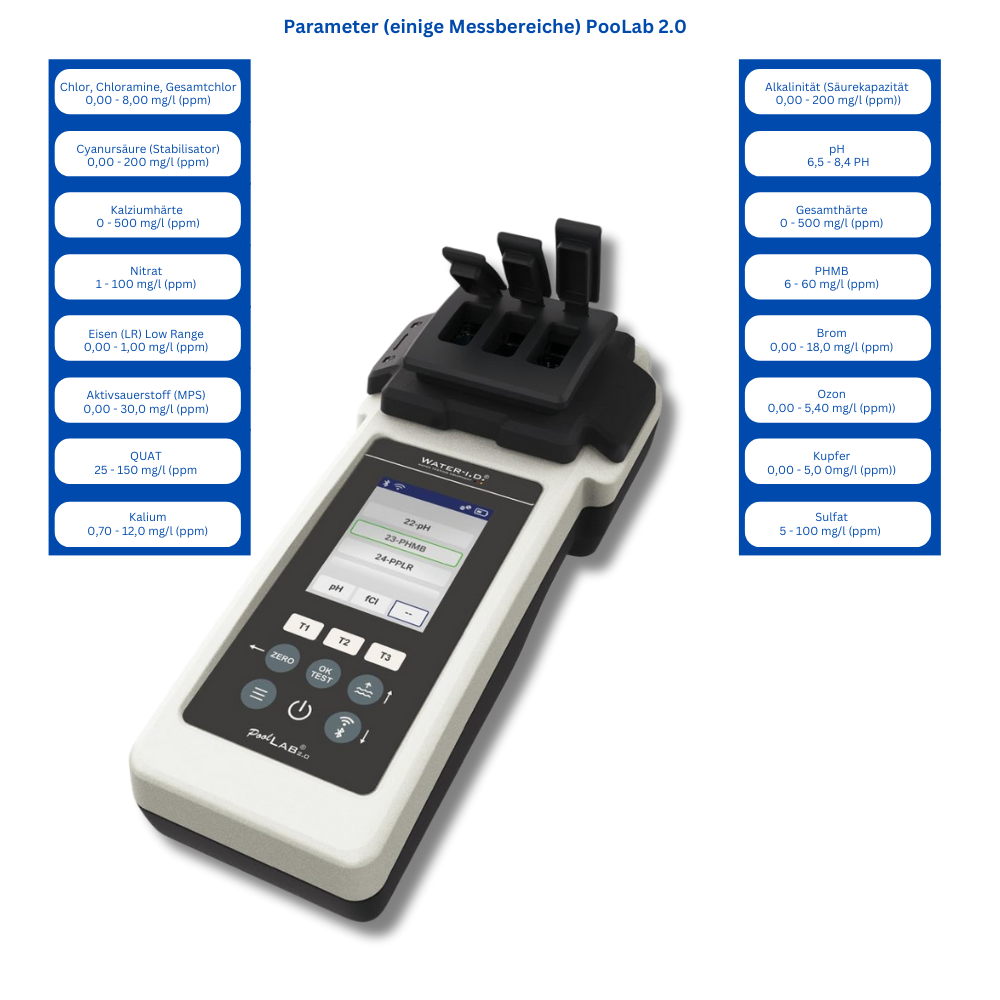 - PROFESSIONELL: Mit dem elektronischen Photometer von PoolLab gelingt Ihnen eine professionelle und präzise Wasseranalyse für Pool, Spa und Whirlpool. Sie können das Wasser auf bis zu 24 Wasserparameter testen. Dabei ist der Photometer IP68 wasserfest.