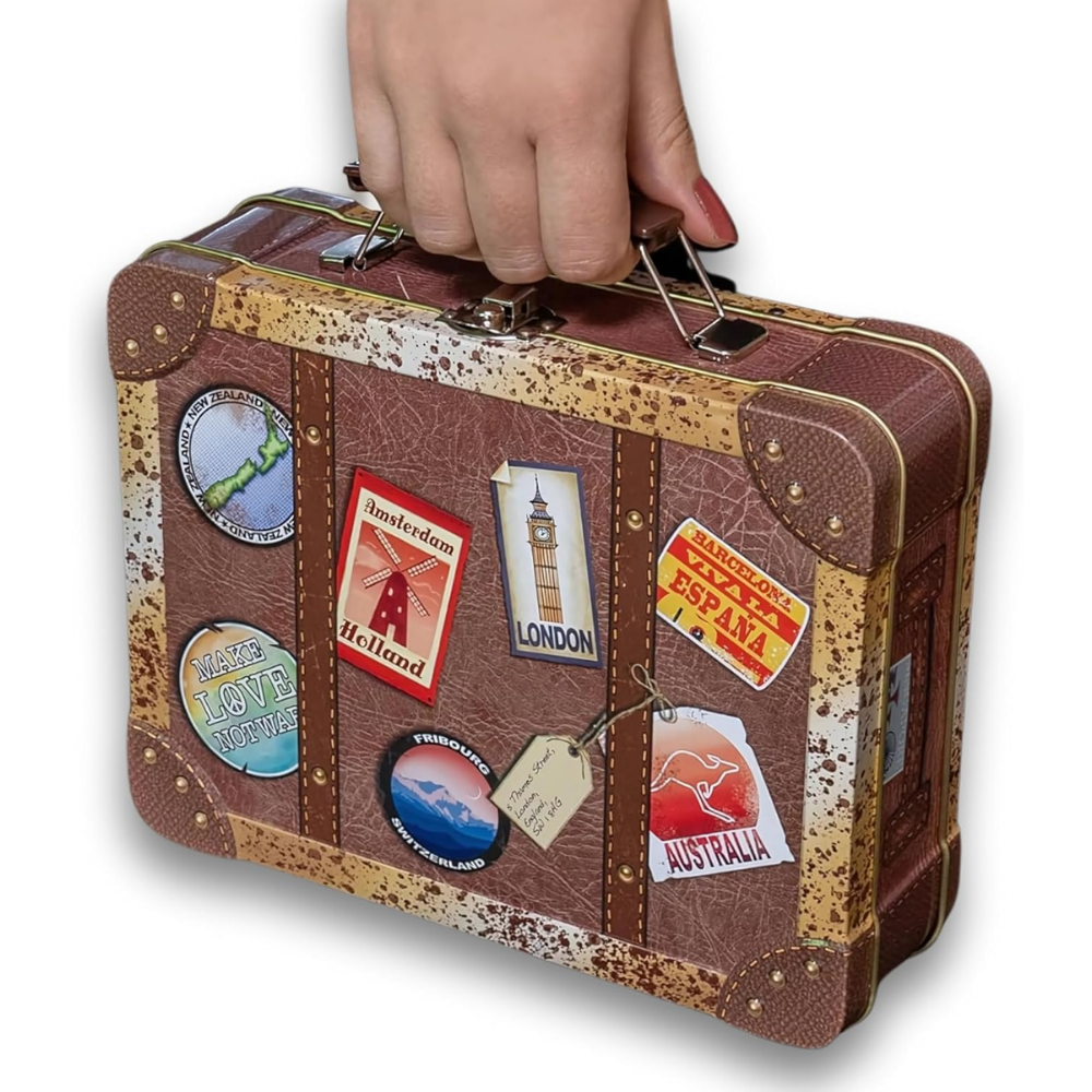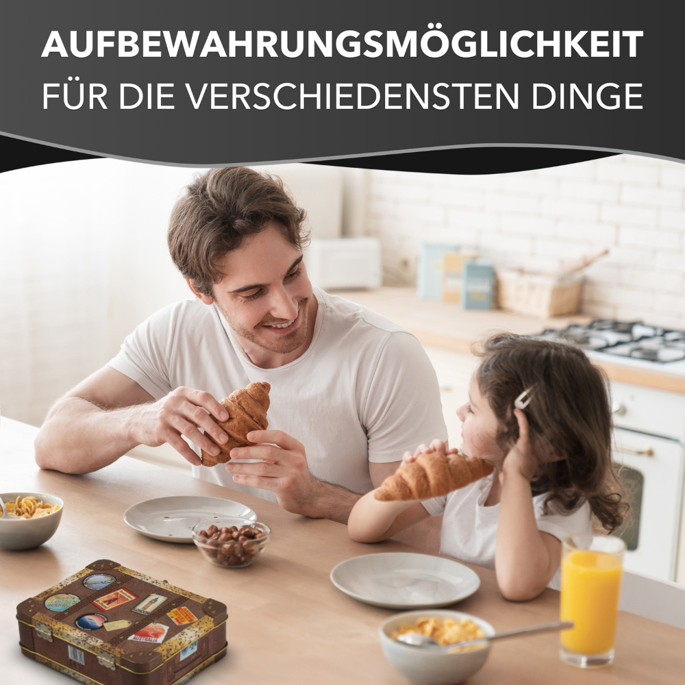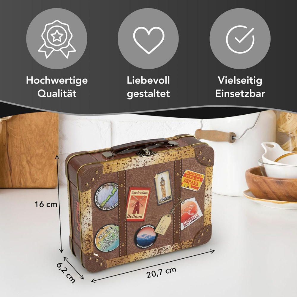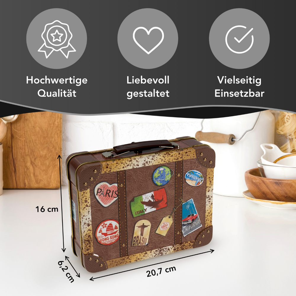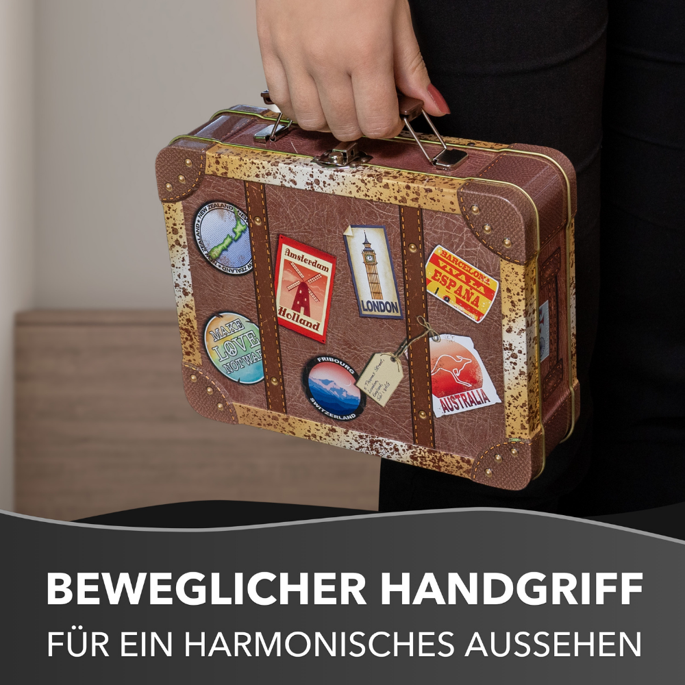 Reisekoffer Vintage – Keksdose mit bunten Stickern, Griff und Schnappschloss