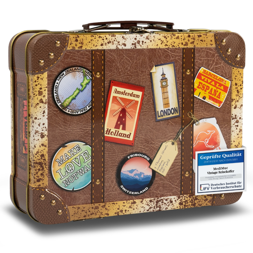 - MediMuc präsentiert eine rechteckige Dose in Form eines alten Reisekoffers in brauner Lederoptik.