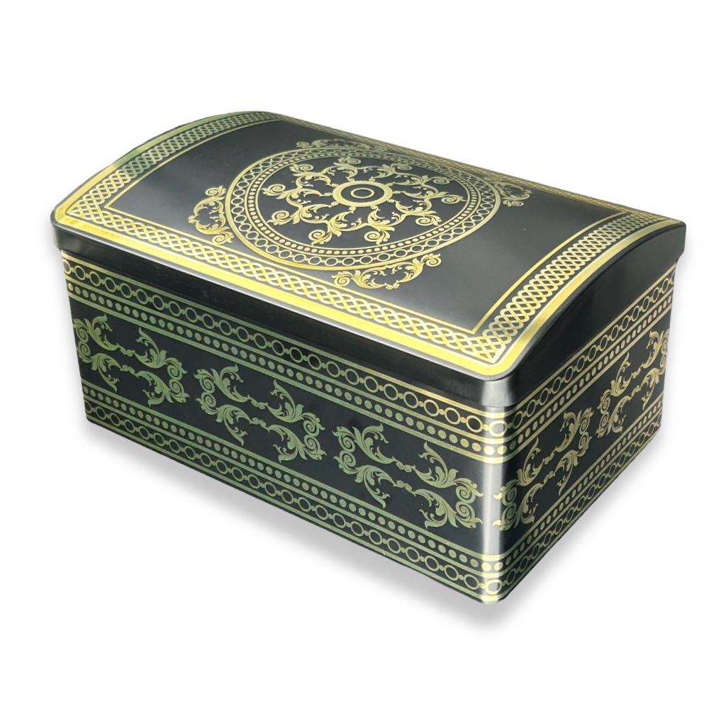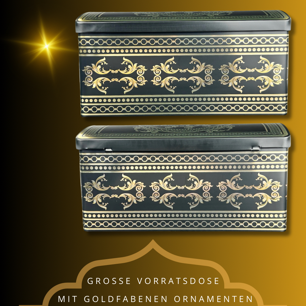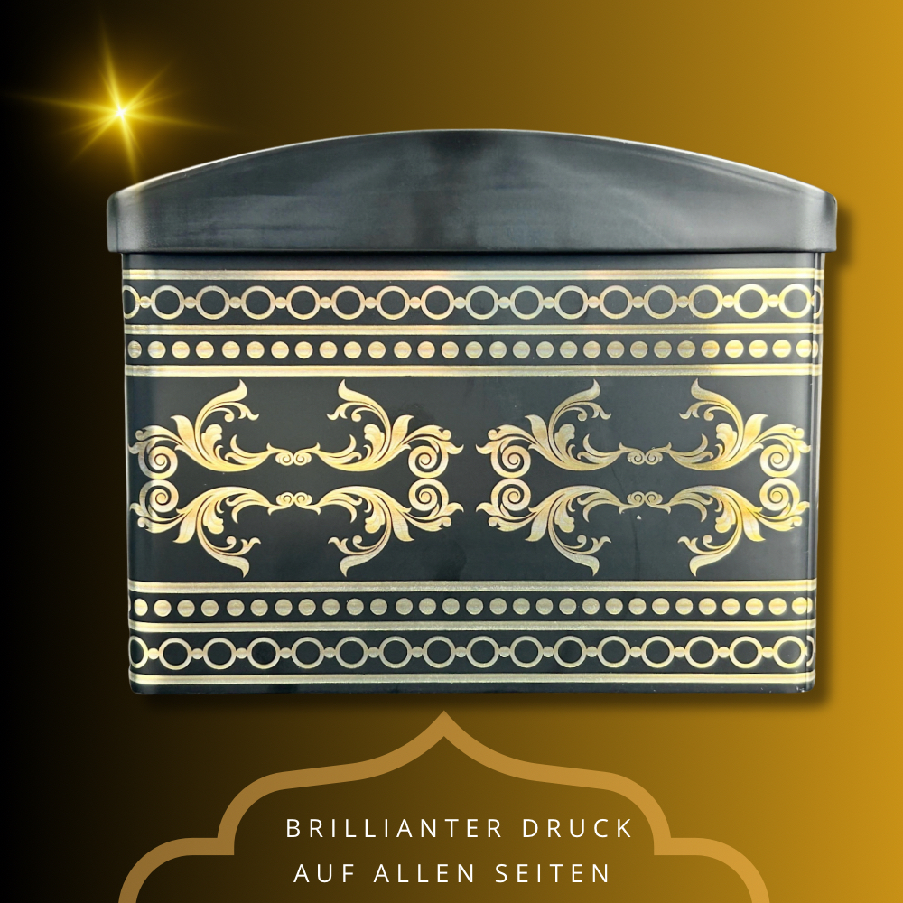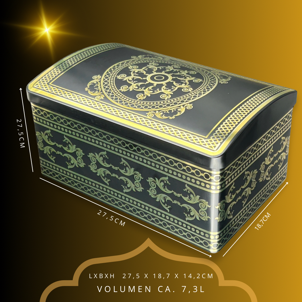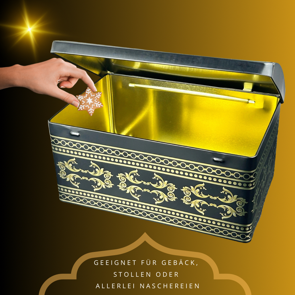 • MediMuc präsentiert eine wunderschöne wunderschöne schwarze Stollendose mit goldfarbenen Ornamenten
