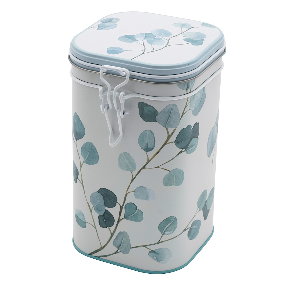 - Die Teedose Trees zeigt Ginko und Eukalyptus Motive und eine matte sanfte Haptik