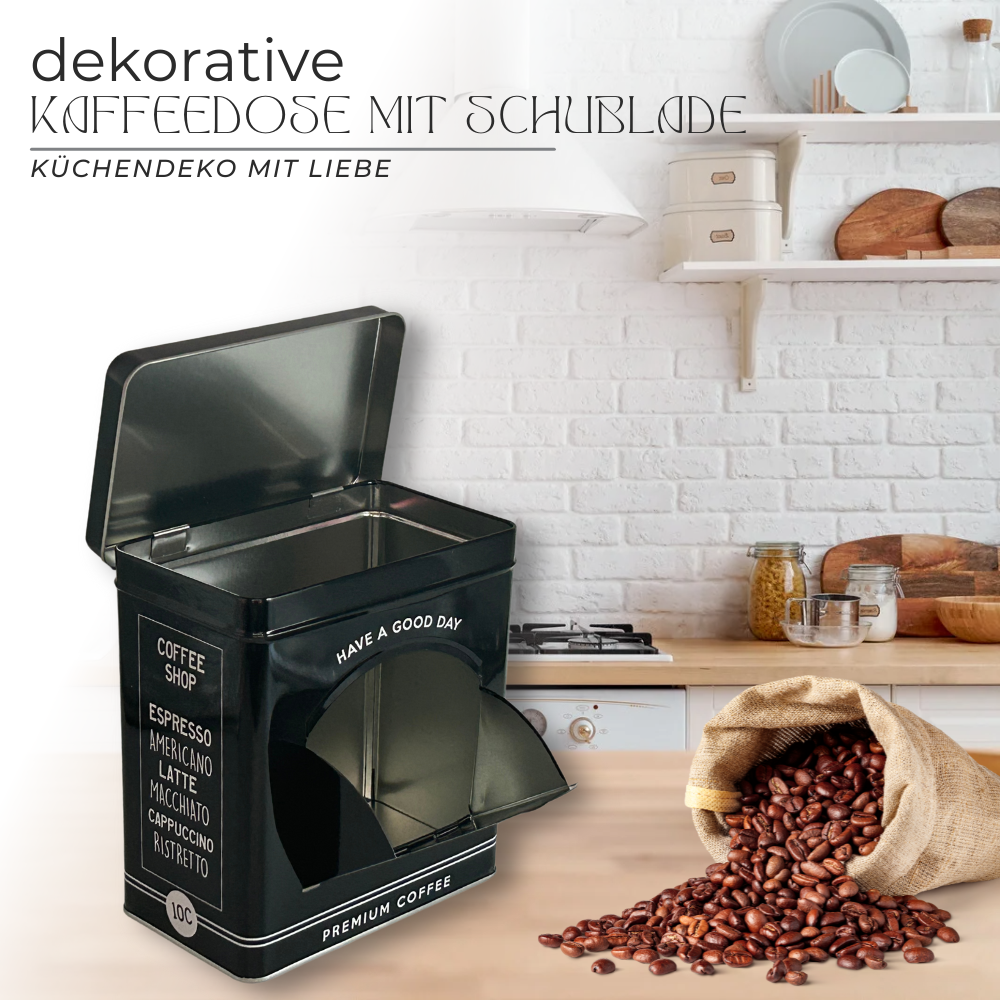 Vorratsdose Kaffeedose Teedose eckig mit Schublade, lackiert schwarz mit weisser Schrift