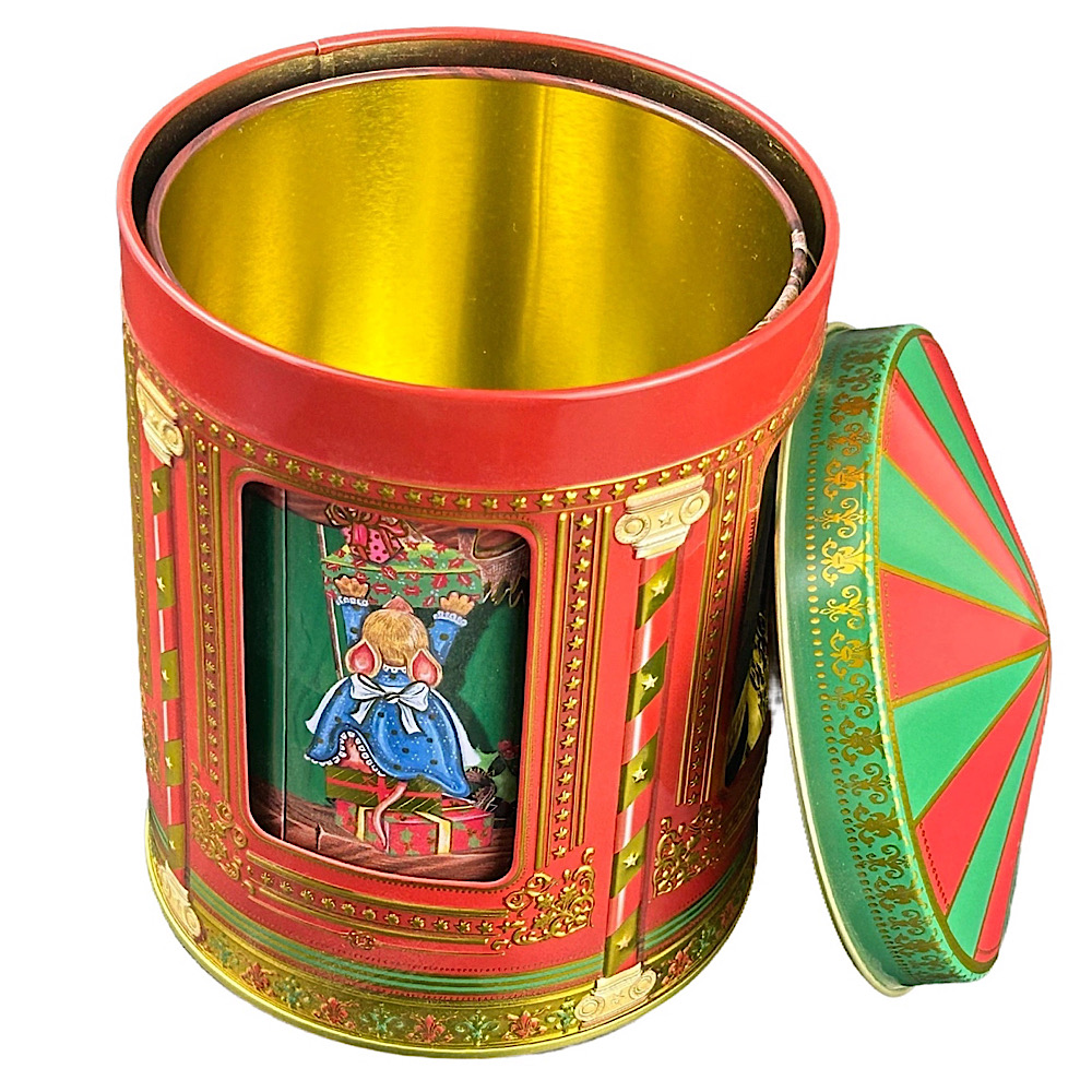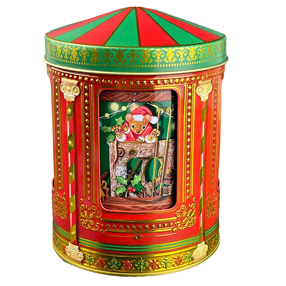 - Innen wird die Dose durch eine Spieluhr angetrieben – Melodie: Jingle Bells